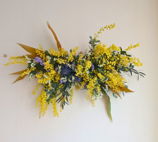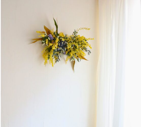 ミモザのオブジェは壁に掛けたり、テーブルに置いたり…飾り方は自由です!